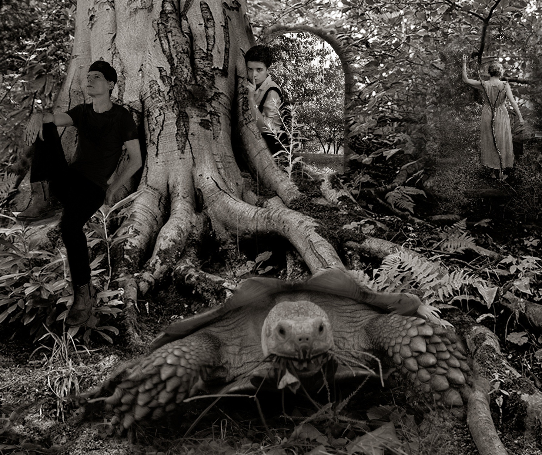 Photographic collage that explores the connection between humans, animals and nature within a mystical, whimsical setting.