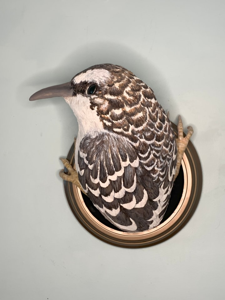 About the Portals Series: If art is the bridge between the imagined and the real, then frames are portals between these two realms. The pieces in this series are not contained by their found-object frames, but rather the frames create doorways that allow bits of my imagination to break into our shared physical reality. I have chosen birds for this series not only because the round shape of the frames is reminiscent of the openings to bird houses, but because birds have a way of appearing as if out of nowhere. Where did they come from, and where do they go? At first, these super-sized creatures appearing in human space can be a little unsettling, leading us to ask if they have found a way into our world, or if we have somehow found ourselves in theirs?