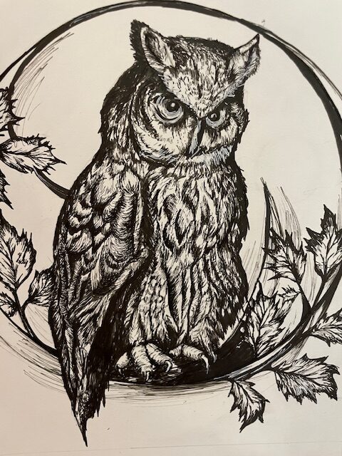 This work was inspired by my mother’s story of an owl that appeared outside her bedroom window every night after my father passed. Its presence carried a quiet power, both mysterious and consoling, as if the natural world had found a way to speak into grief. The owl became a symbol of continuity, a witness that bridged absence and remembrance. Rendered in ink, Protection explores the expressive potential of line as a language of stillness. The circular frame suggests the enduring cycles of life and loss, while the deliberate, meditative marks reflect the patience required to see what remains. Through balance, rhythm, and restraint, this piece honors the enduring presence of love, silent, watchful, and ever returning.