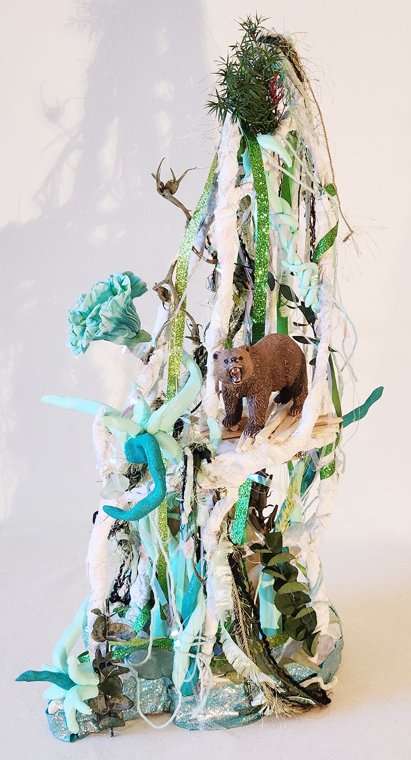 4. Mama Bear Women’s Rights Roar (2024) – mixed-media sculpture (yarn, fabric, dried flowers, gel, plastic, acrylic paint, modeling paste, paper, clay, wire, cardboard); 20 x 21 x 24 in.