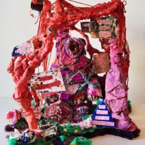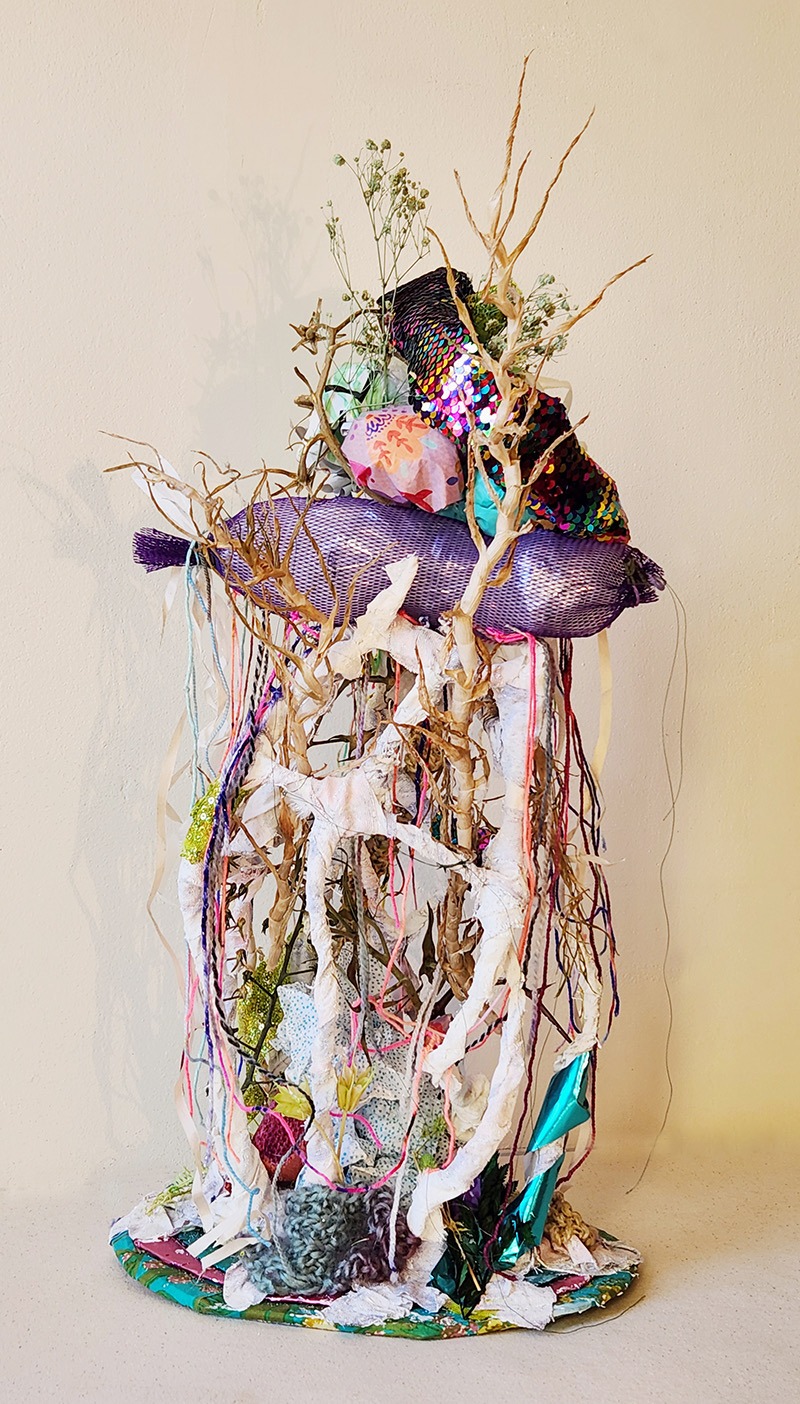 2. Carnival Crash Aftermath (2023) – mixed-media sculpture (yarn, fabric, dried flowers, paper, gel, cardboard, acrylic, wire, modeling paste, plastic, paper, wood); 35 x 19 x 33 in.