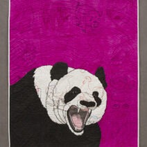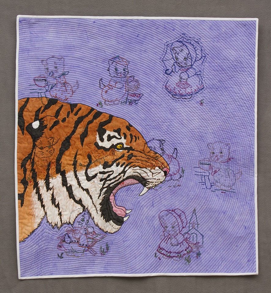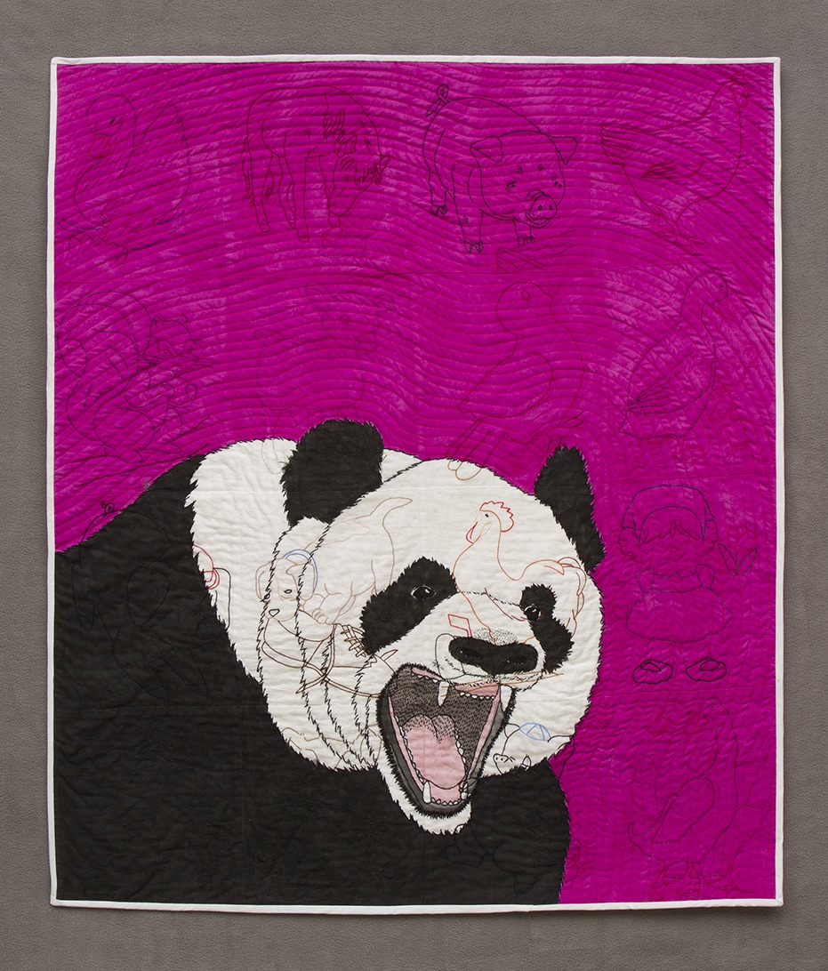 American Childhood is the term I use for this series of quilts which begins with Mid Century baby blankets and quilts collected on the internet or in antique stores. I’m looking at several things here and one is the huge contrast between the cute and sweet images we surround infants with and the violent images we are surrounded with as adults. American babies are tucked in with sweet, anthropomorphized images of animals, but my inference is that animals would feel angry and threatened about their endangerment and environmental degradation. There is a big difference between reality and idealized nature and some tourists have learned the hard way that those are not teddy bears out there.