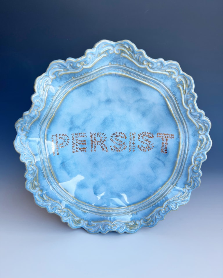 As censorship and oppression have entered science in the United States, clay has become my freedom. Freedom to create unencumbered. Freedom to speak unafraid (actually, I’m doing this scared). And freedom to resist. Through hand built resistance art made in the San Francisco Bay Area, I write truths into stone(ware) so they cannot be erased. Through my Uncensored flutter bowl series, I handwrite banned words in gold luster to remind us all of their value.