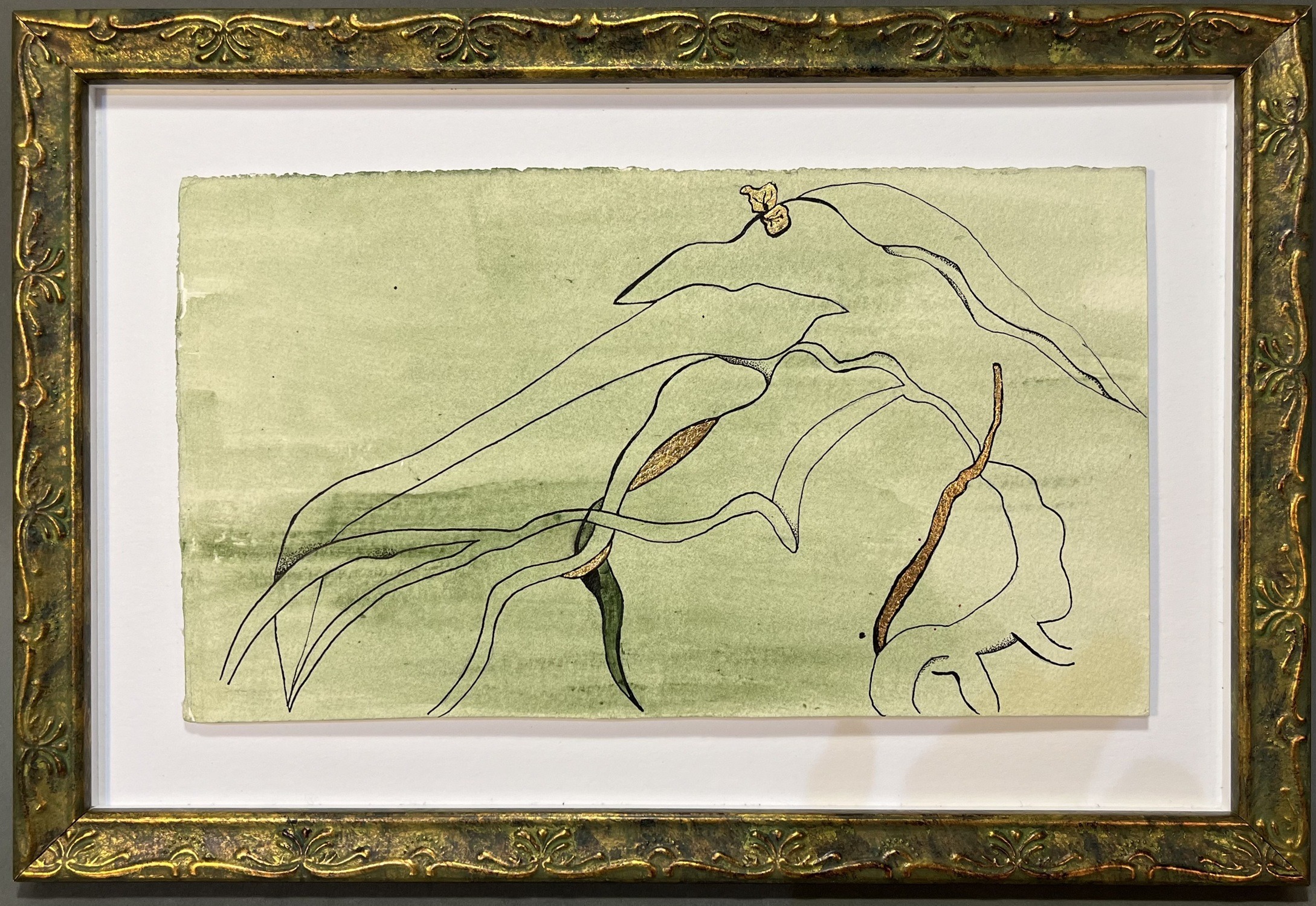 While researching symbols I found asemic writing, a wordless, soundless, calligraphic visual representation form with no specific content. So intrigued by these notations my creative process sparked into a new direction. Words and how we use them, see them as marks on a surface emerged as important in my visual art and as well as my writing. The art work presented here for your consideration is from a series of pieces I produced and continue to produce, using acrylic paint, ink, gold or silver leaf, often cold wax and asemic writing. There is a moment for the audience when reading, watching a play, looking at art where these readers, listeners, viewers are able to take the leap that is being offered by the artist. The place where ‘connecting the dots…’ becomes the interaction of the participant with the art. My intention is to take the audience to this place and allow them their moment. My fascination with tones of nature, roots & branches of trees, as well as asemic writing has lead me to this moment of creative synergy.