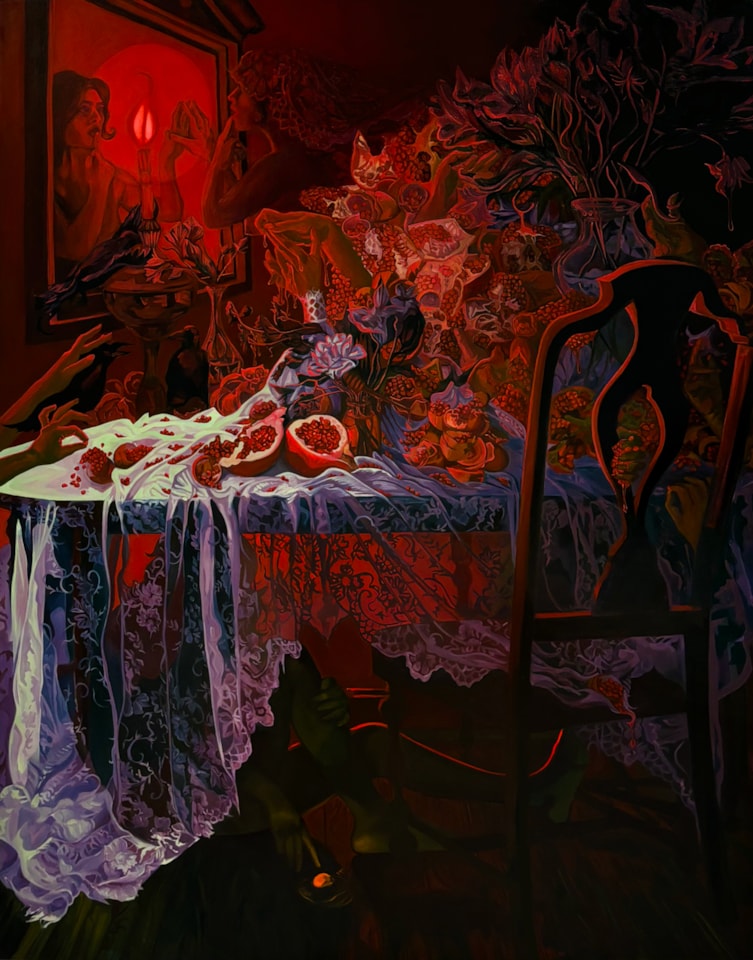 Tara Sabini (she/her) is a maximalist image maker based in Chicago, Illinois. Through a trifecta of symbolism, sensation and gesture, Tara’s still life compositions combine the decadent sensitibities of Flemish memento mori paintings with the poetics of the surrealist zeitgeist, giving way to an examination of the psychological weight and fragility of the feminine life cycle. Tara holds a BFA in Painting from the Rhode Island School of Design, and has exhibited work in numerous galleries across Illinois, Rhode Island and Massachusetts. Most recently, Tara was a 2024-2025 Artist-in-Residence at Lillstreet Art Center and recently opened her first solo exhibition, Shrill Times in Paradise, at the Center’s Annex Gallery.