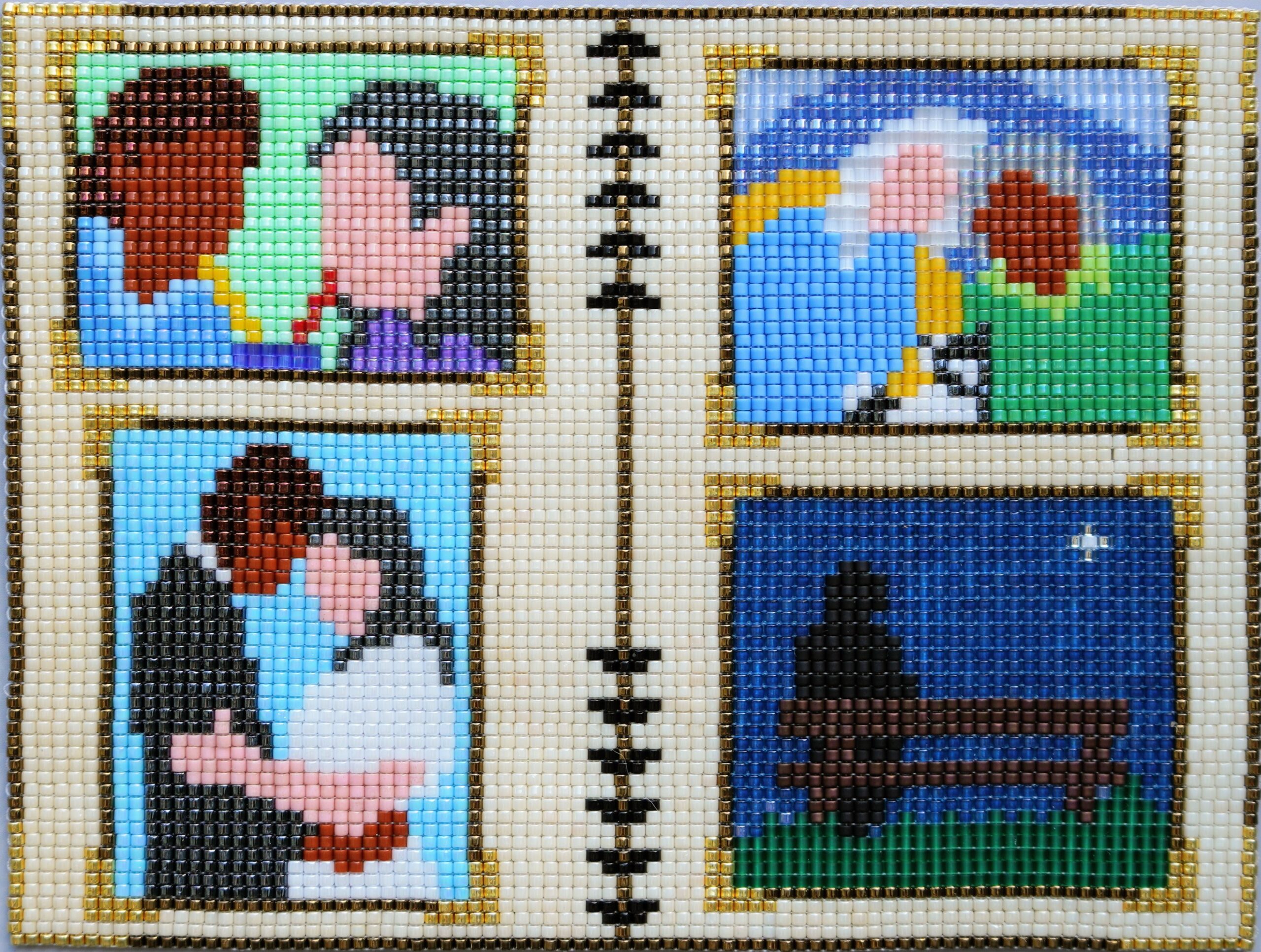 For materials, I source the rare “perfect cylinder” Toho Aiko beads—woven together with strong fishing line. The beads come in iridescent, metallic, matte, and luster finishes. Up to 6,600 of them per piece create a beautiful gleam.
